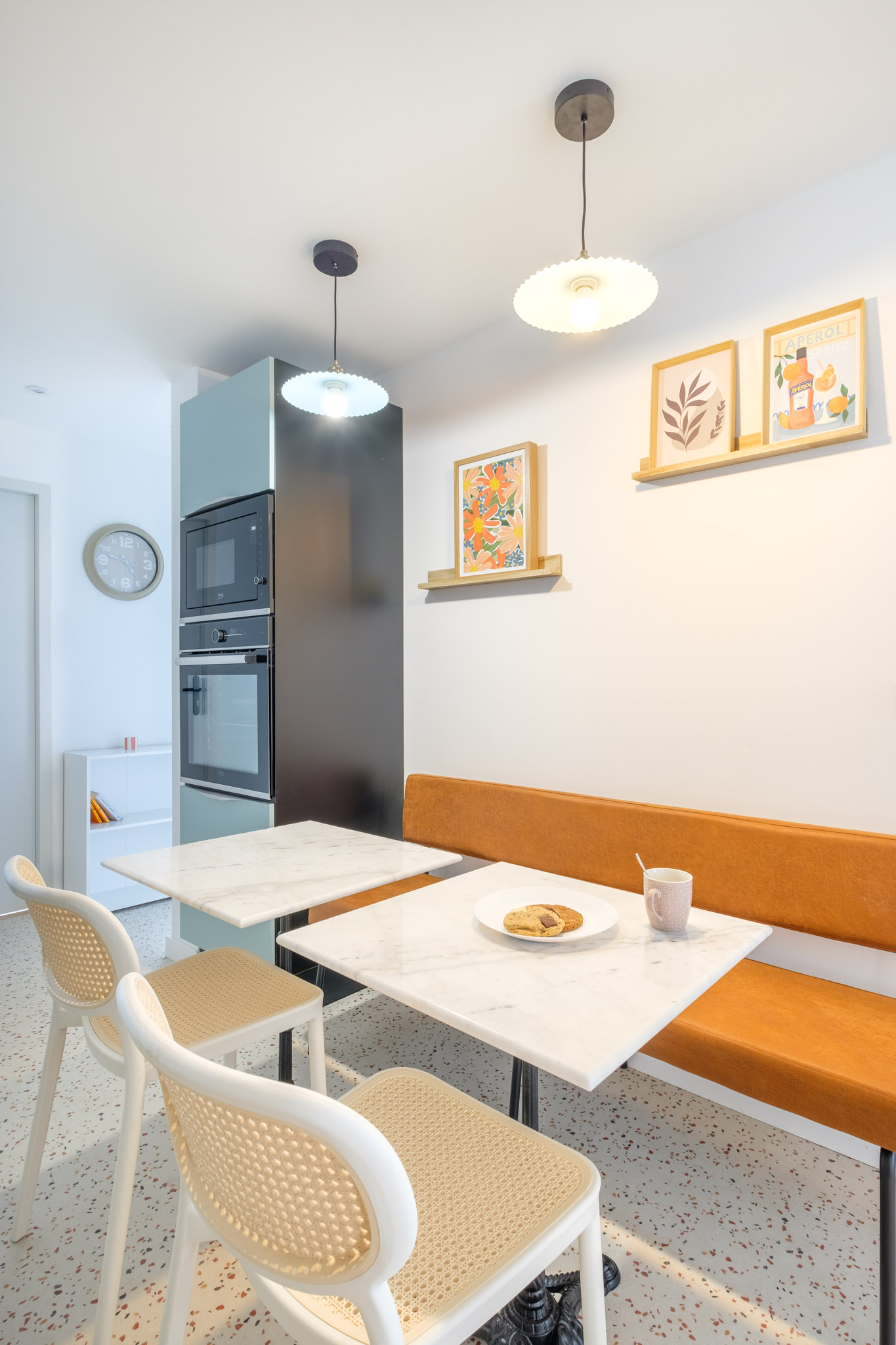 Le principal défi de ce projet de transformation résidait dans l’optimisation de l’espace pour répondre aux besoins d’une colocation, tout en préservant une superficie suffisante pour créer un espace de vie à la fois convivial et esthétique, adapté à cinq occupants. La contrainte était d’autant plus marquée que cette pièce de vie se situait dans une zone aveugle de l’appartement, dépourvue de fenêtres, ce qui exigeait une réflexion approfondie sur l’apport de lumière.
