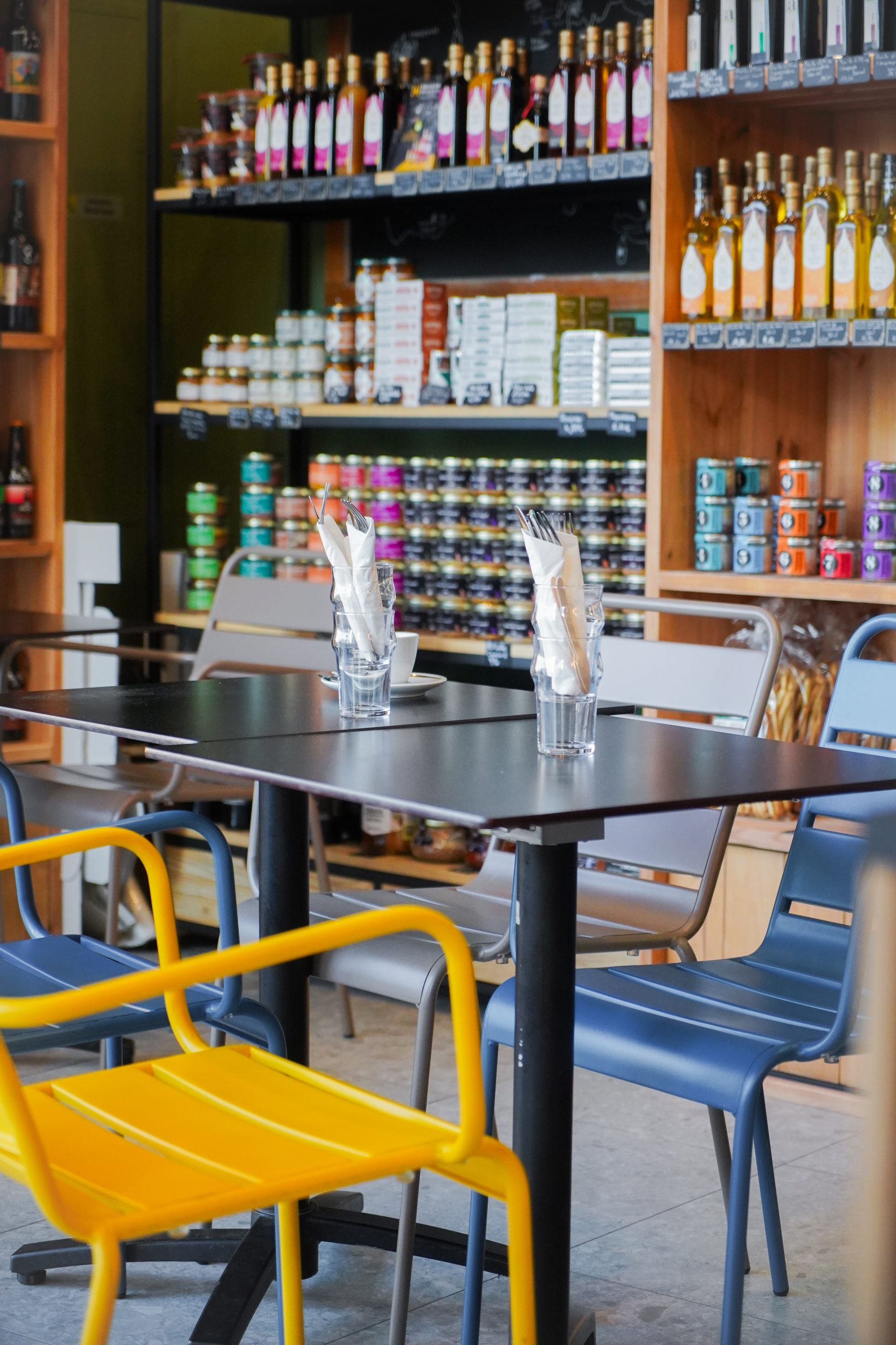 Concernant l’agencement, le mobilier a été choisi pour maximiser les linéaires de produits sans alourdir l’espace. Les étagères sont en partie en fer noir et répondent parfaitement à la verrière installée côté cuisine.